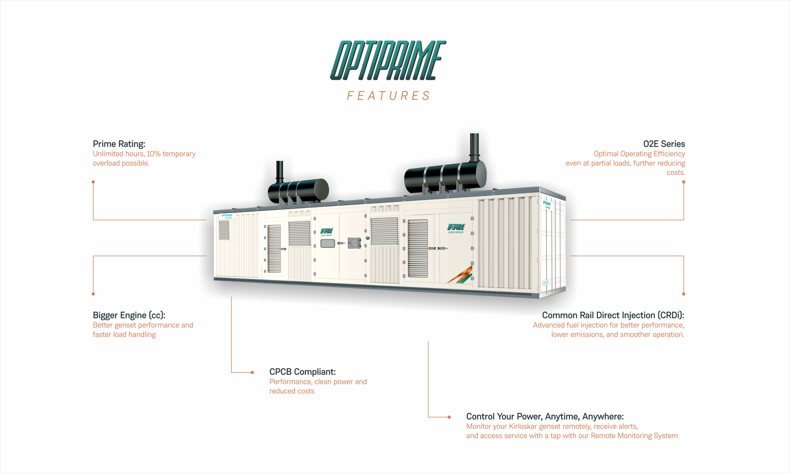The Kirloskar Optiprime 500 Series DG set is a high-capacity, industrial-grade generator designed for continuous and prime power applications. Ideal for large industries, IT parks, hospitals, and infrastructure projects requiring uninterrupted power backup.